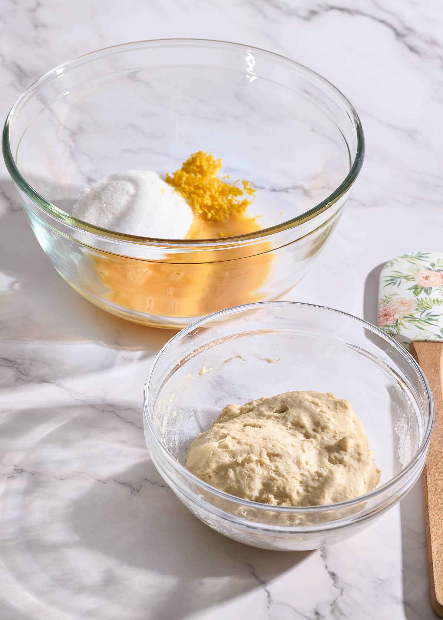 • En un bowl colocar los huevos, el azúcar, la ralladura de limón, el extracto de vainilla y el pre fermento. Mezclar bien.