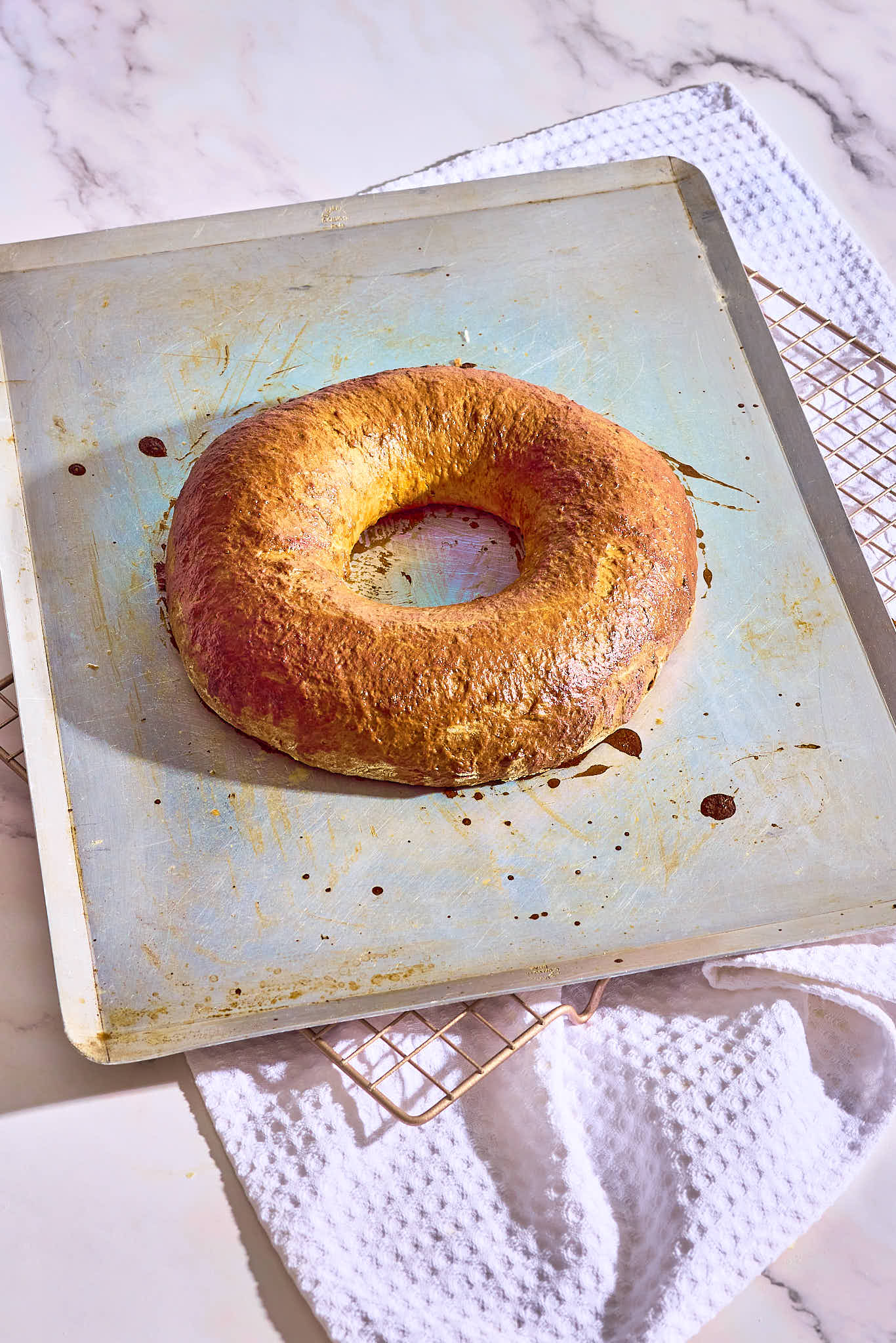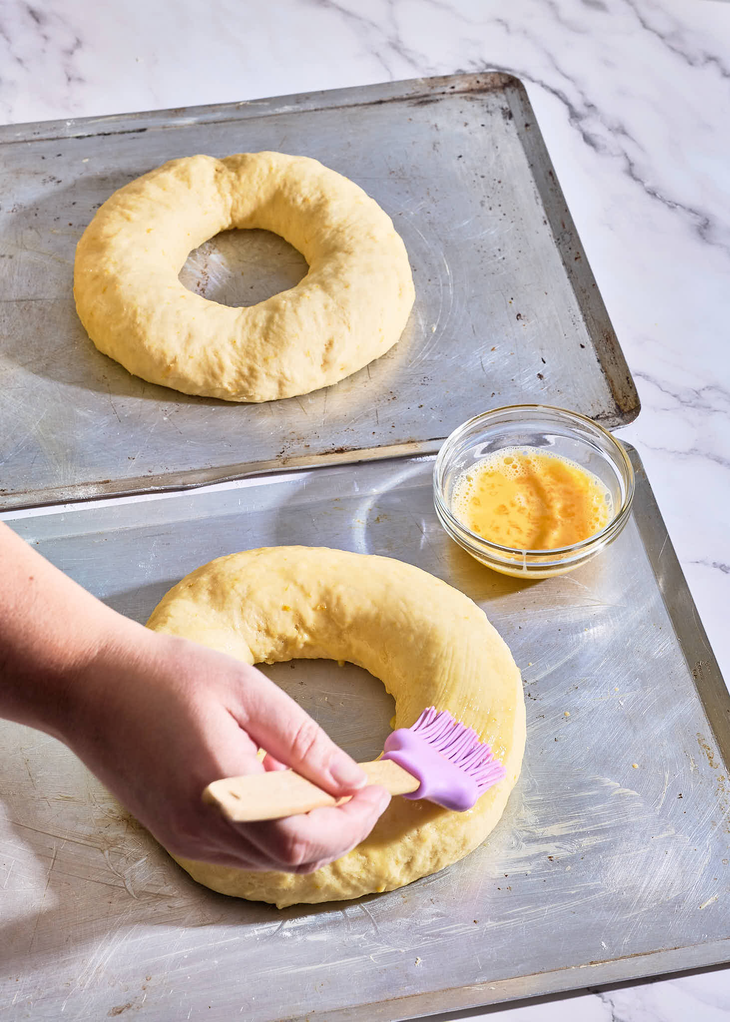 • Enmantecar una placa y colocar la rosca con cuidado de no romperla. Pintar la rosca con doradura. Dejar fermentar hasta que duplique su volumen nuevamente.